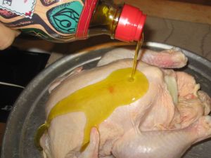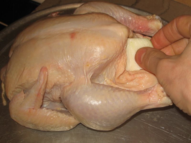 This is not necessary, but I like to put onions and garlic in the chicken’s cavity…as the chicken cooks it flavors from the inside-out. Herbs and chilies–or whatever flavors you like–work well also, but there wasn’t nary a fresh herb in the house.