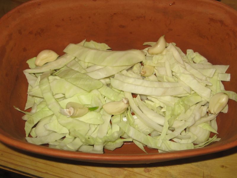 You can place your chicken directly into the pot, but I chose to make a “bed” for it, using sliced onion, cabbage, and whole garlic cloves…this later becomes part of the meal.