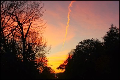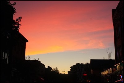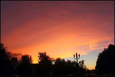 Pinkish-orange sky. This was the view in front of me as I rode home this evening. Lovely autumn weather. Beautiful.