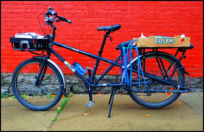 A brief comment…So about two minutes after taking the below photo I rounded a corner–one I do nearly every day, so I wasn’t really thinking about it–and I hit a patch of wet leaves in the rain and the bike quite literally slipped out from under me. It was the oddest thing, it just sort of slid out and left me standing there. It fell with a clunk (v3 Mundos are heavy) but nothing fell off, not even the cardboard box. I simply lifted the bike up and went on my way. 🙂