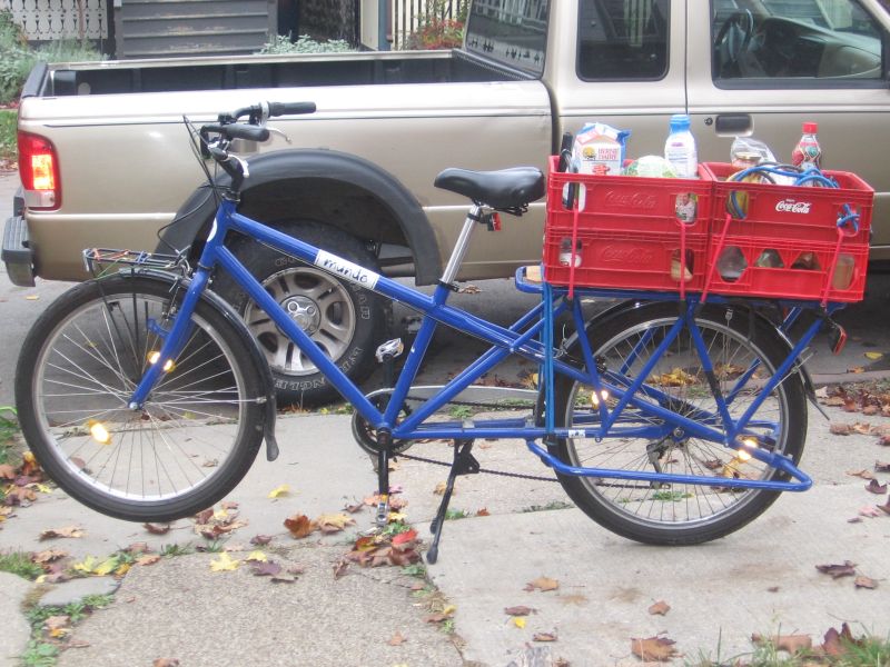 In the event that you haven’t come across it yet, there’s an interesting and quirky little quarterly paper called The Practical Pedal, which as you may have guessed is about practical bicycling (Click here for their website). There’s another paper devoted to urban cycling called Momentum (which is a little larger and has more content, click here for their website). I’ve often thought how great it would be to have print editions of either of these magazines in Western New York (the closest place I’ve been able to get Momentum is Toronto, and The Practical Pedal is nowhere near this area). At any rate I emailed both magazines (separately) suggesting they send me some and I would deliver and distribute them for free (by bike, of course). I’ve emailed back and forth with an editor from Momentum a few times…seems I need a commitment from the local community before they can send them (i.e. advertisement). Then I emailed Wiley over at The Practical Pedal…he emailed me back the next day saying, “sure, sounds great.” He had a bundle (100 copies, I believe) sent via ground freight….that’s them sitting on the Yuba. (If you’re reading this Wiley you can see that the Yuba can handle many more bundles than one.) I’m planning on dropping them around town this weekend. My plan is to take them to places in Allentown and the Elmwood Village. If you’re a Buffalonian reading this and have a specific drop off suggestion let me know.