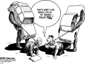 A couple things. Firstly, I have no idea where this photo is from, but it could be a shot of any suburban street in America (I found the photo and the below cartoon here). And secondly, if you are a suburbanite reading this I mean you no disrespect (I spent my teen years in the suburbs), I just think that urban living makes a lot more sense (and I am more comfortable there). If you like suburban living that’s your choice, I am not trying to tell you otherwise. But from a biker/walker/car-lite person, this is how I see it.