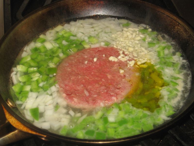 While the burger was simmering I started the polenta by sauteing some diced pepper, onion, and garlic in olive oil.