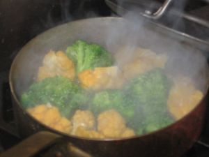 While this was sauteing and the burger was simmering I steamed a few florets of broccoli and orange cauliflower (I purposely over cooked them so they would be soft…no al dente here).