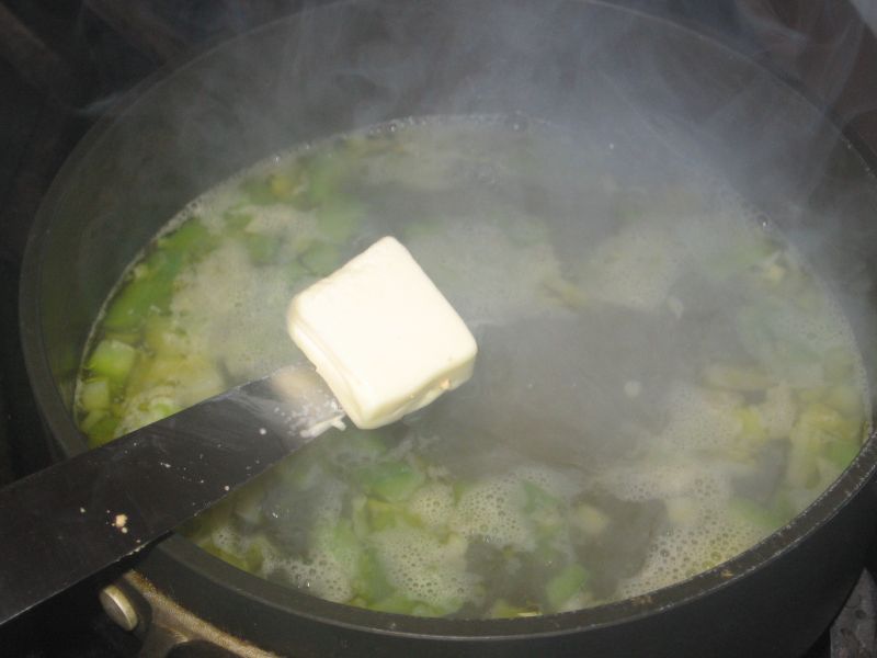 Now I returned to the polenta (for a recipe and how-to video, click here). I added chicken broth, quickly brought it to a boil, seasoned it with sea salt and added a good sized pat of butter.
