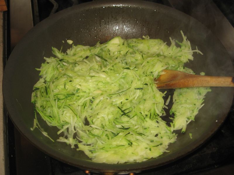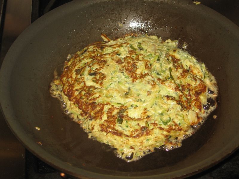 Transfer the cooked zucchini to a bowl and stir it for a minute or two to cool it slightly. Then add a little Parmesan cheese and a couple of eggs. Add a little more olive oil to the pan and heat it over high heat. When the oil is hot add the zucchini/egg mixture.