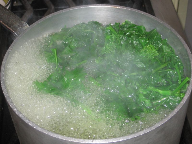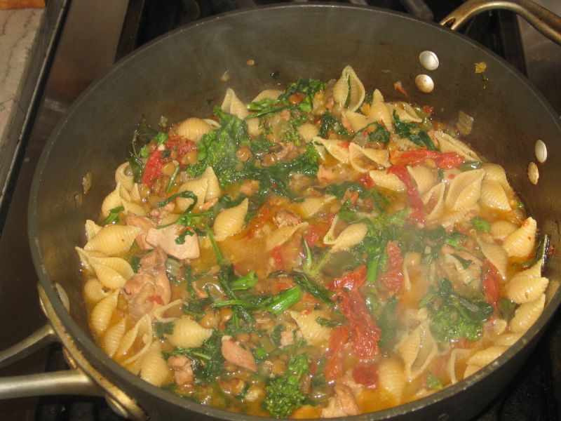 While the chicken and lentils were cooking I blanched a bunch of chopped rapini (to remove some of its bitterness), saving the boiling water to cook the pasta in (plus, the water contained nutrients from the rapini).