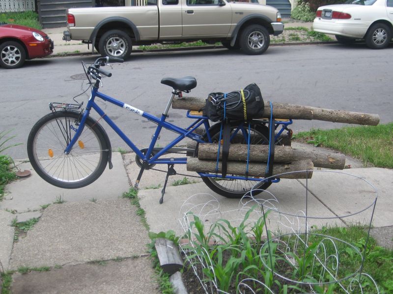 I came across these logs in the trash on my way home from the gym this evening (hence the gym bag)…while some may just see trash…I saw next year’s fuel. I only took half of them because that’s all I felt I could safely carry (believe-it-or-not I actually know my limits…sometimes). These logs were heavy…by far one of the heaviest loads I’ve carried (maybe the heaviest). They were recently cut down so they are still full of moisture, which of course translates to weight. I have to admit that this is the first time I felt any significant frame sway on the Mundo…it’s probably a good thing I only took six logs (I actually had eight loaded but removed two).