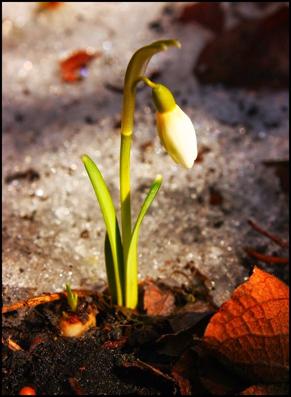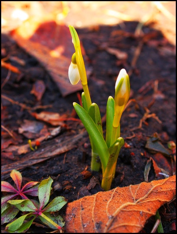 I saw these snowdrops pushing up through the snow and dead leaves in the garden today as I entered my place of employment. Nice, I thought. Finally. Signs of life after this bitter cold and harsh winter.