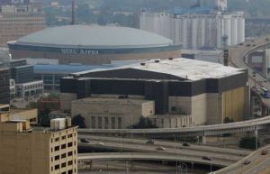 Now back to the local landmark that I mentioned earlier. I’m of course referring to Buffalo Memorial Auditorium. It was built in 1939 and has seen it’s day. It has been replaced by the HSBC Arena. Almost like an omen, the newer, more modern arena hulks just behind the older one (and almost eerily hulking behind the arena is a grain elevator, reminding us of Buffalo’s history on the Erie Canal.