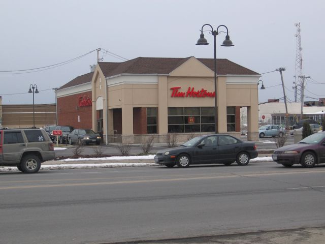 I was in North Buffalo at the time, and even though this is still within the city limits it really has a suburban feel to it in places, this being one of them. I noticed straight away how not only were there no bikes locked up, but there was a trail of cars leading around the building cued to the drive through window. After parking my bike I went inside and I was literally the only customer inside the shop, the place was bustling but from the outside-in. I’m sure it would have been much faster for many of the people to park their cars and walk into the store; but that’s just it, I guess…they’d have to leave their cars. Here’s a photo with cars leading around the building: car is king. (But for how long, that’s the real question?)