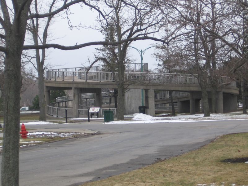 One of the (many) things that I have always enjoyed about riding a bike is that you get to see so much. Take today, for example. I could have completed all my errands in about an hour or so, but instead I took a meandering bike ride (that also included a stop at the health club, lunch, coffee, and and shopping for some staple items). Riding the bike took a better portion of the afternoon, but it was so enjoyable…and I burned calories not gasoline. And I probably would not have gone out of my way to stop and see the demolition of a local landmark (more on that in a minute). What is truly for sure, is that if I were in a car I most certainly not have took a short-cut (a long-cut, actually, because it was out of my way) through Delaware Park. This park is an oasis in the city no matter what season. It was designed by Frederick Law Olmsted, who also designed, among others, Central Park, in NYC. Part of the fun to ride a bike through Delaware Park is to go across the curly pedestrian bridge that goes over the highway next to it; the bridge has a corkscrew ramp on both ends.
