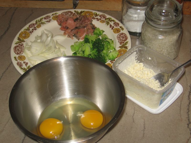 Preheat your oven to 400F. Gather the ingredients; par-boil the broccoli, then slice it along with the onion and salmon.