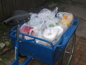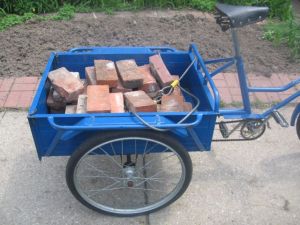 I found this used Chinese trike on craigslist about a week ago and bought it on the spot. It’s more of a novelty than anything, but it’s a real workhorse. It’s geared low and the maximum speed is probably like 5mph, but that’s not a bad thing because the brake system sucks, to put it mildly (one of the photos shows this…a leather strap that is pulled tight around a drum on the axle). It’s precarious to ride, and takes some getting used to…the looks and comments I get are interesting. As one might expect it can really carry stuff…here’s some pictures: one is with a weeks worth of groceries (with plenty of room to spare), one is where I have it loaded with 4 bags of topsoil (40 pounds each), and yet another loaded down with bricks for my garden. The real problem with the brakes (or lack there of) comes to full reality when trying to stop a trike loaded with bricks or 160 pounds of dirt. But that’s also what makes it interesting…it’s a fun bike to ride. This trike is just one more reason not to use my gas guzzling vehicle.