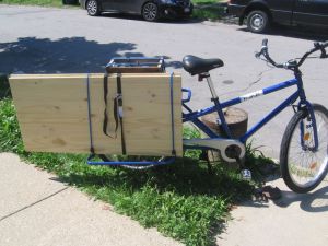 Here’s a couple pictures of my trial run today. On the right side of the bike are two sheets of wood measuring 2 by 4 feet each; one is a piece of plywood I used to make a top deck for the Mundo (see below) and the other is a 3/4 inch thick slab of solid pressed pine which I’m using as a kitchen counter.