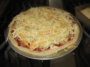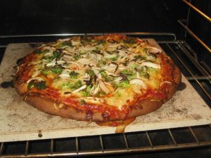 Place it in the preheated oven, initially on the pan, then after 10 minutes remove it from the pan and place it directly on the pizza stone (if you have one). If you don’t have a pizza stone just leave it on the pan. Here it is at 5 minutes, 10 minutes, and twenty minutes. Yum! It was/is delicious.