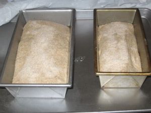 Shape one piece into a loaf and place it in an oiled loaf pan, and place the other piece on an oiled pizza pan and gently push and form it to the pan. Cover the bread dough with plastic wrap and set aside to rise. At this point you should also preheat an oven to 450F.
