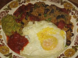 I still have not gone grocery shopping. I really think it has something to do with working in a grocery store…I have developed an aversion to shopping. Here I am a chef and I have almost no food in the house. What is up with that? But I am a master at turning leftovers or very few ingredients into something good. So after taking inventory of my meager ingredients I came up with this plate of huevos rancheros…vegetarian rice and beans (it’s still Lent), homemade guacamole (found in the freezer), salsa, and still-warm sourdough bread. The rice is seasoned with vegetable stock, tons of caramelized onions and garlic, cumin, ancho chili powder, and a pinch of saffron. When the (brown) rice was almost cooked I added the cooked beans and a few frozen peas I came across. Topped off with a fried egg and glass of wine (ok, glasses of wine…I’m still sipping one as I type these words), I am one satiated camper.