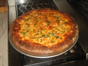 Had the day off today and felt like having pizza…looked in the fridge and found some tomato sauce, broccoli, and cheese. Had a few onions, too. When making dough it’s just as easy to make enough for two things as it is one, so I made enough to bake a loaf of bread as well. The basic recipe is so easy. Here’s the recipe: