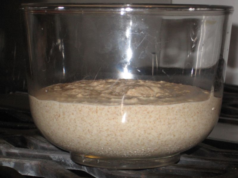 This is what it looks like after 2 hours. The difference in size is easily visible, but if you look close (click on the photo for a larger picture) you can see that it is full of bubbles too. The yeast is fully activated and it is in the process of fermenting the flour.