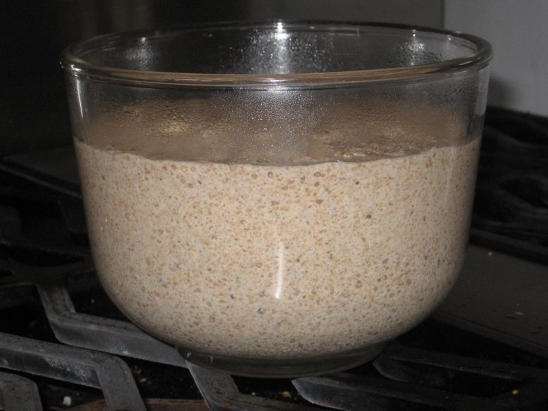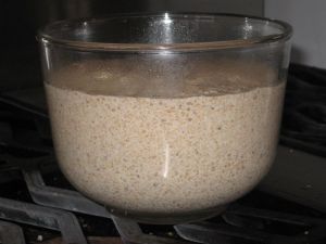 In a small bowl mix together 1 1/2 cups whole wheat flour, 1 1/2 cups room temperature water, and two teaspoons instant yeast. Cover the bowl with a plate or plastic wrap and set aside for 1 to 12 hours. It makes a sort of paste, this will later turn into what is called a “sponge” (or what the French refer to as a “poolish”), here’s what it initally looked like: