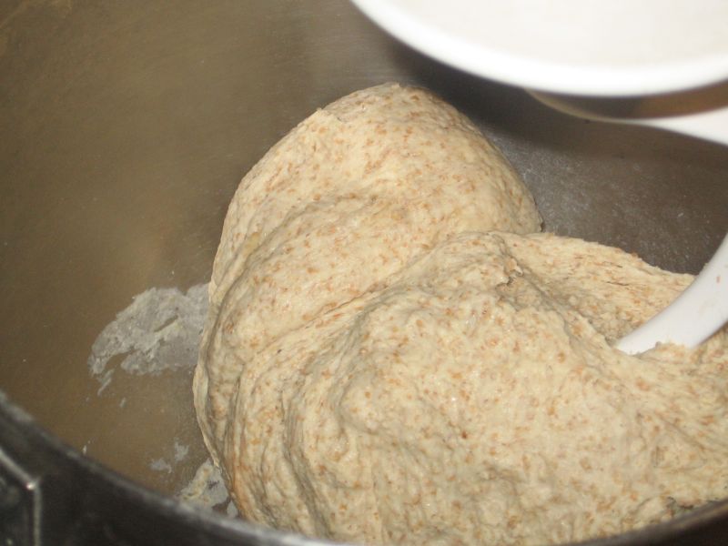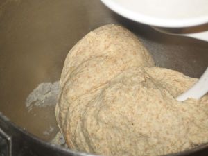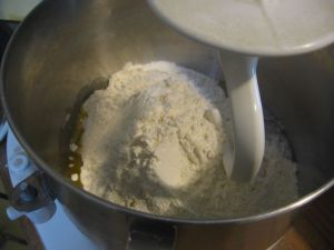 Now transfer the sponge to an upright mixer that is fitted with a dough hook. Add about 2 3/4 cups unbleached bread flour, a couple tablespoons of honey, a couple tablespoons of olive oil, two more teaspoons of yeast, and a couple teaspoons of salt.