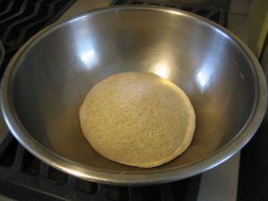 Rub a pizza pan with some olive oil, place the dough on it, and rather than using a rolling pin…push and mold the dough to the pan using your fingers.