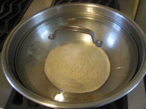 Cover the bowl with plastic wrap or a lid to keep it moist (I use a clear lid from a pot…it fits the bowl pretty good and I can see its progress.