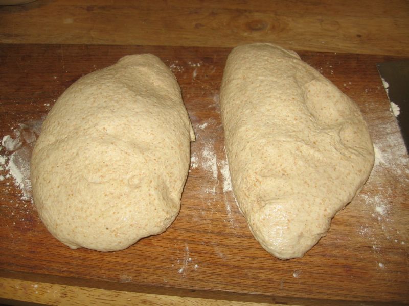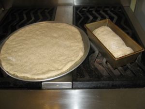 Shape one piece into a loaf and place it in an oiled loaf pan, and place the other piece on an oiled pizza pan and gently push and form it to the pan. Cover the bread dough with plastic wrap and set aside to rise. At this point you should also preheat an oven to 450F.
