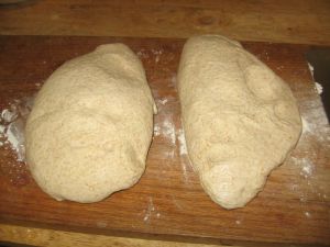 This is enough dough for two small loaves of bread or one small loaf and a 12-inch pizza. So at this point flour a work surface and gently turn the dough out of the bowl (try not to entirely deflate it). And then cut it into two pieces.