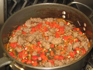 Remove the pan from the heat, add about 8 ounces or so of ground beef or lamb (I prefer lamb, but used grass-fed organic beef because that’s what I had on hand). Also add about 1/2 c