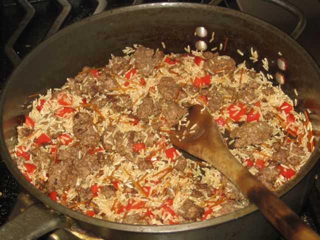 Add the beef back to the pan, then add about a 1/4 teaspoon each of ground cinnamon, allspice, cumin, and black pepper; stir the spices over the heat for just a minute or so. Add a cup of long grain brown rice to the pan and stir it over the heat to coat it with the oil and spices.
