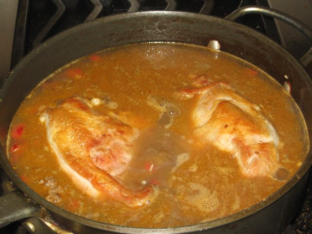 Start by searing a couple chicken breasts until they are golden brown. Use a heav