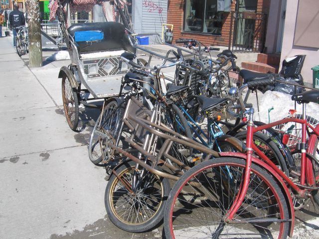 I came across this pile of locked up and rusted bikes in the Kensington Market (click on the photo for a larger view). Note the old French delivery bike, and the bicycle rickshaw.