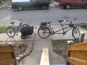 and his backpack a mere 2 miles. This is how I did it, and it was actually pretty simple. I hooked my bikerev trailer to the tandem, and wedged the front wheel of my son’s bike into the trailer with the lid off, creating a sort of bike train (note the plank I use to walk the tandem, which weighs a ton, down my front stairs). It was a little precarious, and I’m sure people thought I was a little nuts, but it rode fine (my son’s bike only tipped over once when it hit a pot hole (a Buffalo-just-after-the-winter