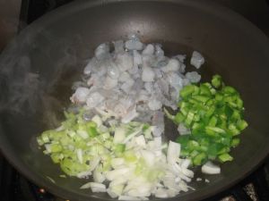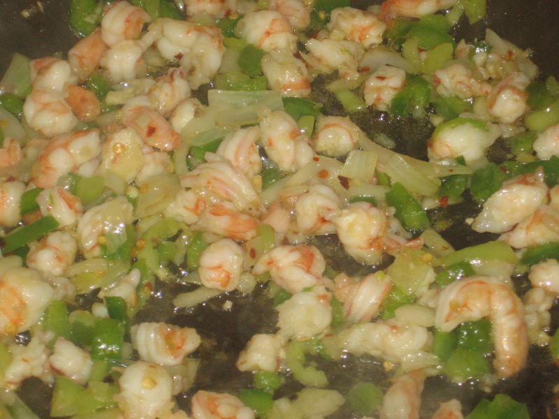 When the shrimp is cooked and the peppers and onions are translucent but not browned (be careful not to burn the garlic) transfer it to a plate and set aside.