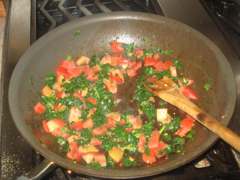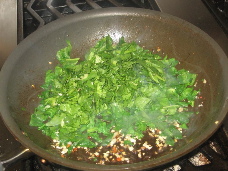 Wipe the pan out, add a little more olive oil, along with some chopped spinach (that has been washed and dried), and a little more garlic (sorry…I like a lot of garlic) and some hot pepper flakes.