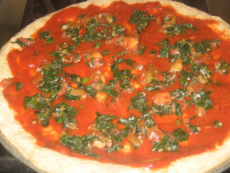 Spread a thin coating of tomato sauce across the dough, and sprinkle it with the spinach/tomato mixture.