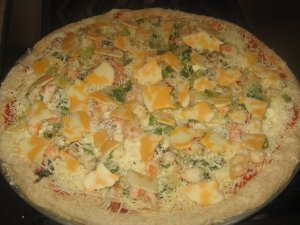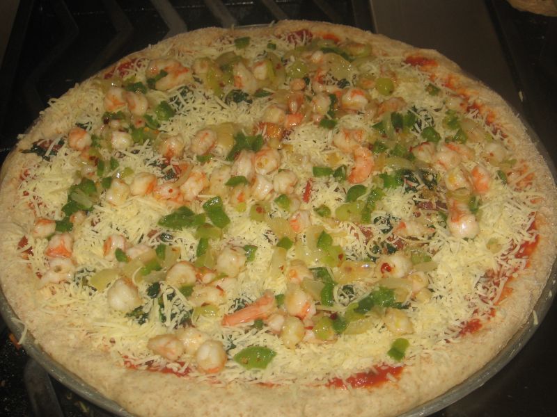 Four Cheese Pizza with Shrimp and Spinach on Honey-Whole Wheat Sourdough Crust