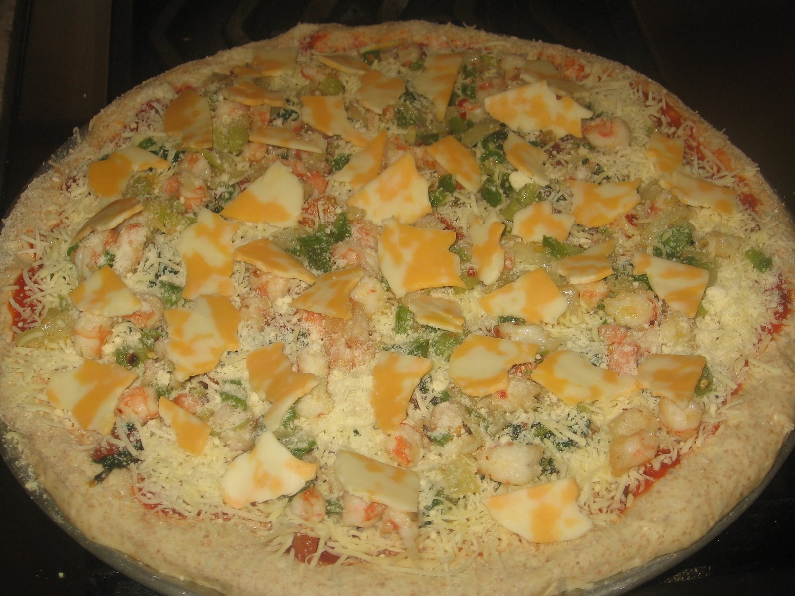 >Four Cheese Pizza with Shrimp and Spinach on Honey-Whole Wheat Sourdough Crust
