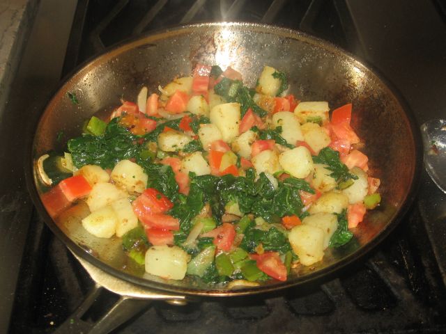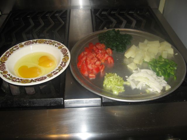 Lastly, here’s an easy vegetable fritatta recipe…makes a great breakfast, lunch, or dinner: Slice or chop some vegetables (I used onions, sweet peppers, hot peppers, cooked spinach, cooked potatoes, and tomatoes). Saute them in a hot skillet. Add some eggs. Top it with cheese, and bake it in a 400F preheated oven for 5 or ten minute. Quick, easy, nutritious…and delicious.