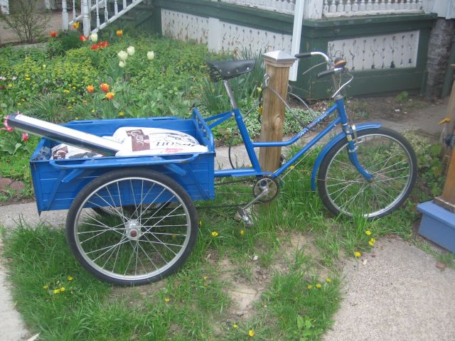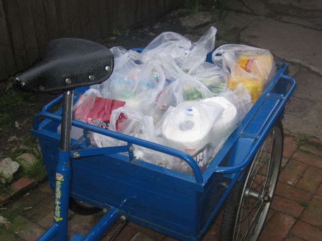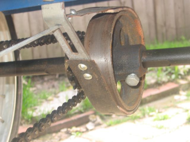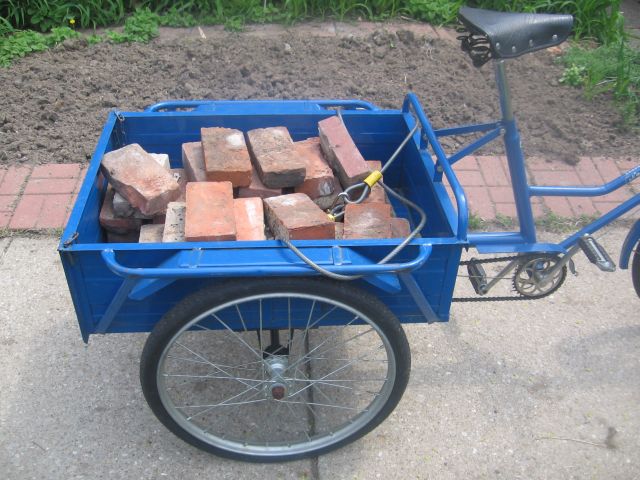 >I found this used Chinese trike on craigslist about a week ago and bought it on the spot. It’s more of a novelty than anything, but it’s a real workhorse. It’s geared low and the maximum speed is probably like 5mph, but that’s not a bad thing because the brake system sucks, to put it mildly (one of the photos shows this…a leather strap that is pulled tight around a drum on the axle). It’s precarious to ride, and takes some getting used to…the looks and comments I get are interesting. As one might expect it can really carry stuff…here’s some pictures: one is with a weeks worth of groceries (with plenty of room to spare), one is where I have it loaded with 4 bags of topsoil (40 pounds each), and yet another loaded down with bricks for my garden. The real problem with the brakes (or lack there of) comes to full reality when trying to stop a trike loaded with bricks or 160 pounds of dirt. But that’s also what makes it interesting…it’s a fun bike to ride. This trike is just one more reason not to use my gas guzzling vehicle.