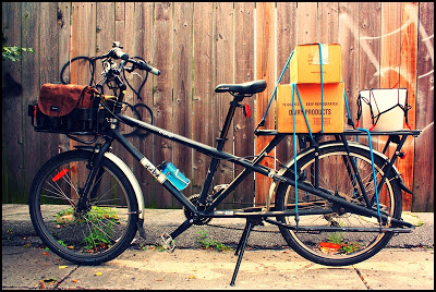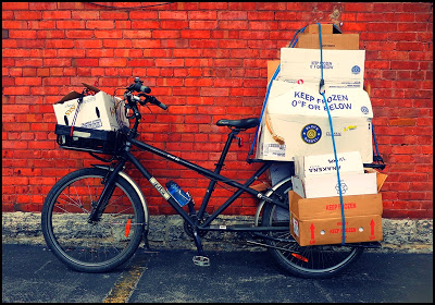 On the bike…approximately 150 hard-cover books in seven cardboard boxes on their way to my favorite local used book shop.