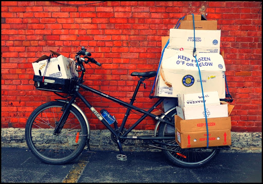 On the bike…approximately 150 hard-cover books in seven cardboard boxes on their way to my favorite local used book shop.