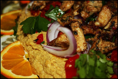 Hummus with Fresh Herbs, Sun Dried Tomatoes, and Seven-Spice Chicken