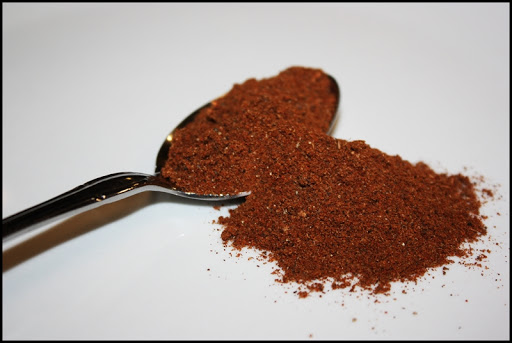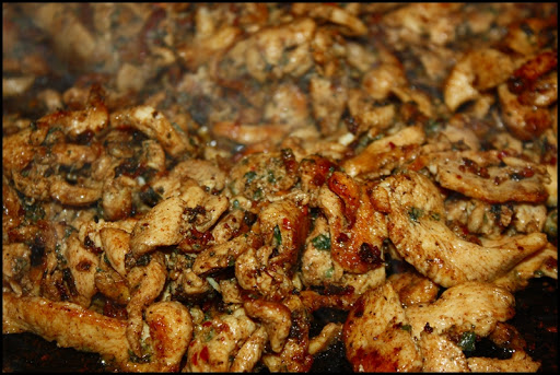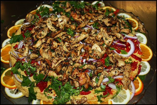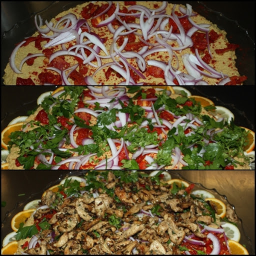 This is something I made for an employee meal today. It is really, really delicious (I ate so much I wished I had a bed to take a nap afterwards) and of course really simple to make. It is basically a hummus recipe layered (loaded, actually) with all sorts of good things. But the prize, or the topper, is the seven-spice chicken. Seven Spice blend is a common Lebanese spice mix and there are as many versions of this as there are people who make it. The Arabic word for this blend is baharat, which simply means spices. In addition to the hummus and chicken, I also layered in raw, thinly sliced red onion, sun-dried tomatoes (I would use fresh in the summer months), and whole leaves of both flat-leaf parsley and cilantro (fresh coriander). And just before serving I drizzled the entire platter with a liberal amount of extra virgin olive oil (yum!). I hope you try this recipe…you’ll be glad you did.