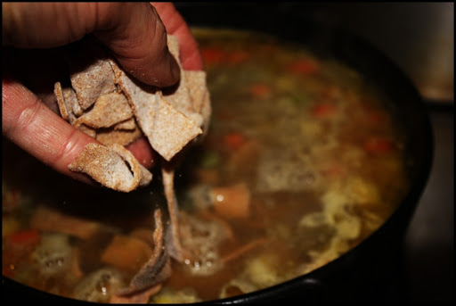 What is it about chicken soup? Even when I go through one of my “very-little-meat” phases I still welcome and crave this simple food. It’s a sort of cultural phenomenon…every culture and nationality has their own version of this humble dish. One of my favorite names for this recipe is “Jewish Penicillin,” making reference to its supposed properties to cure the common cold. And historically speaking it is likely one of the oldest recipes…next to cooking over a live fire, putting things in a vessel and boiling them is one of the oldest known cooking methods. There are plenty of ways to make this dish, and a seemingly endless variety of ingredients one can use, but this is a version I made the other day. It is easy and delicious. The homemade noodles were an added bonus, but if you want to make the recipe and use store-bought (or none at all) it will be equally delicious. This is also a good Base recipe,” meaning one in which you can add or subtract flavorings or ingredients to make it your own. The addition of chilies would make this interesting, as would a bit of fresh ginger and soy for an Oriental flare. More garlic, a splash of lemon, and a few sprigs of cilantro (and a sprinkling of curry) would give it a distinctive Near East flavor. You get the picture. Now if you’ll excuse me, I think I’ll go have a second bowl of soup…