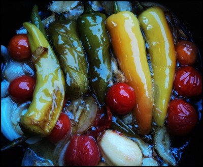 The above is a photo of something I made as a side dish for dinner last night….tomatoes, peppers, onions, and whole garlic cloves basted and braised slowly in a cast iron Dutch Oven just five feet from where they grew. Delicious (and easy)…my mouth waters as I type these words. It’s really just a modern version of the French poele method of braising and basting things in butter.