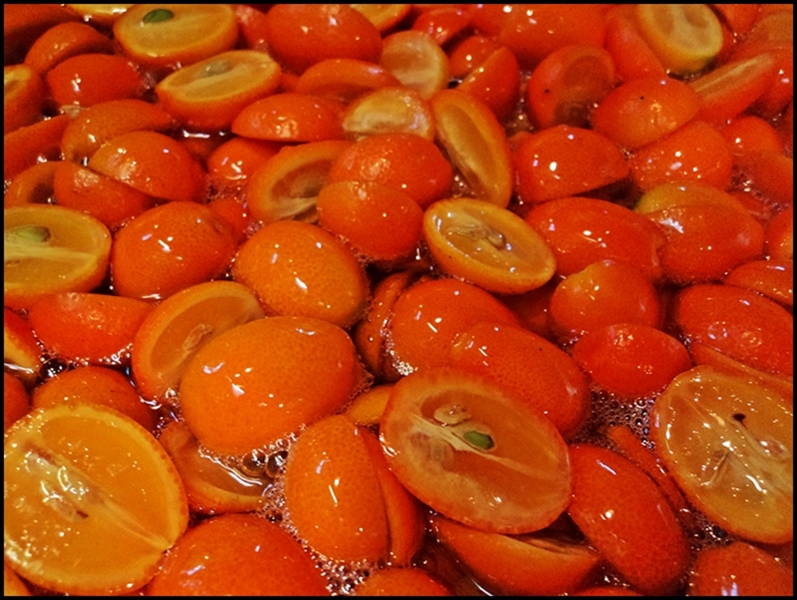 This is a basic recipe that can be used for nearly any hearty citrus fruit. You simply simmer the fruit in a basic simple syrup for a few minutes and allow it to cool. It turns even the most bitter or sour fruit into something soft and sweet…once cooked you eat not just the fruit’s innards but its skin and rind as well. The once sour and bitter fruit can be nibbled as is, or used as an elegant dessert garnish. And a bi-product is that you’ll also have a delicious flavored syrup. This is recipe equally good with sliced lemons, limes, or even grapefruit…but other unripe fruits–such as peaches or pears–are delicious as well (they just need a bit more care lest the fruit breaks apart during cooking. Left in the syrup the fruit will keep for weeks in the refrigerator…that’s if you don’t eat it first.