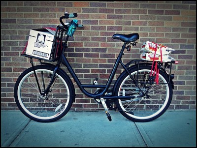 On the bike…A cardboard box containing a dozen eggs, a half-gallon of milk, a half gallon of orange juice, and a small canvas bag that contains–among other things–a book, a magazine, and a camera. And on the rear rack, two bags of dog food; 4 lbs, each.